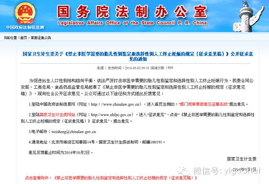 | 导读 | 为促进出生人口性别结构趋向平衡,依法严厉打击非医学需要的胎儿性别鉴定和选择性别人工终止妊娠行为,我委会同公安部、工商总局、食品药品监管总局起草了《禁止非医学需要的胎儿性别鉴定和选择性别人工终止妊娠的规定(征求意见稿)》,向社会公开征求意见。 |