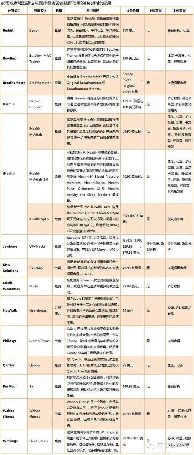 从硬件制造商的角度来分析HealthKit应用,iPhone的传感器已经可以搜集一些健康相关的数据,不过想要搜集诸如血压、血糖等数据,光靠手机显然是不够的。有哪些设备可以提供第三方的传感器并且把数据传输到HealthKit中呢?下面是一些可以搜集并分享数据的设备及其搭配应用的盘点,动脉网将其整理为表格如下。