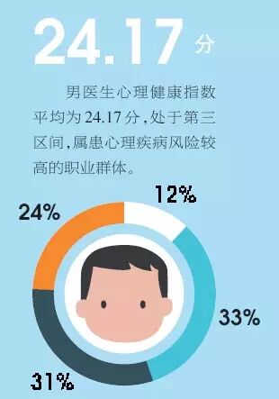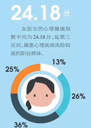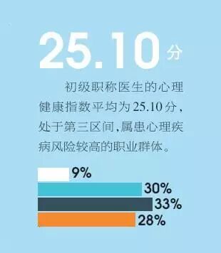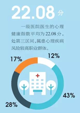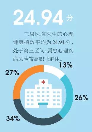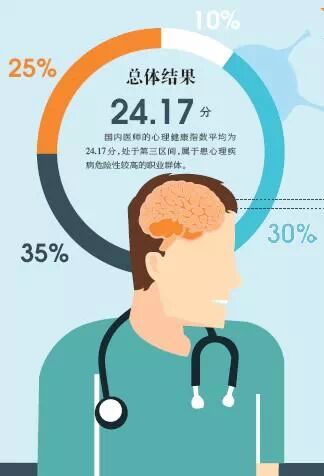 结果显示,国内医师的心理健康指数平均为24.17分,处于第三区间,属于患心理疾病危险性较高的职业群体。其中,只有10%的医生处于第一区间(15分以下),属于低风险人群;30%的医生处于第二区间(16-21分),属于风险较低人群;35%的医生处于第三区间(22-29分),属于风险较高人群;25%的医生处于第四区间(30-50分),属于高风险人群。