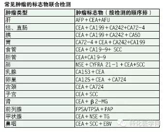 其次,为了提高肿瘤标志物在临床诊断中的准确性和检出率,我们建议对部分肿瘤采用联合检测的方法。我们汇总成表列举如下(见下表)。