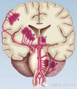 A 皮质动脉穿通支---脑叶出血 B 外侧纹状体动脉---壳核出血