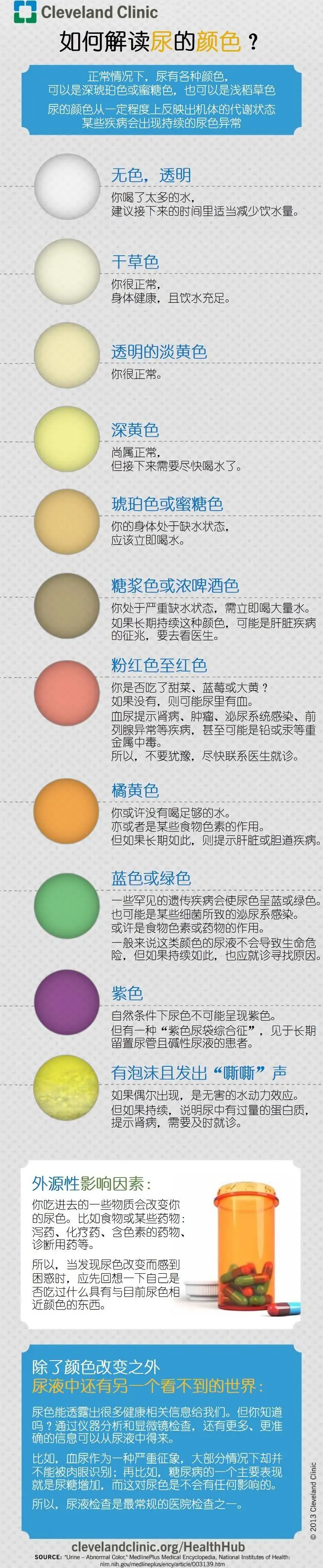 尿液颜色是健康的一种“指示剂”,此图告诉你尿液各类颜色的含义。
