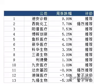上周IVD行业指数样本中,迪安诊断、西陇化工和阳普医疗分别位列涨幅榜前三位,而九强生物、迪瑞医疗和达安基因则位居倒数前三名。基因诊断概念股紫鑫药业上周的涨跌幅为5.40%,千山药机则继续停牌。