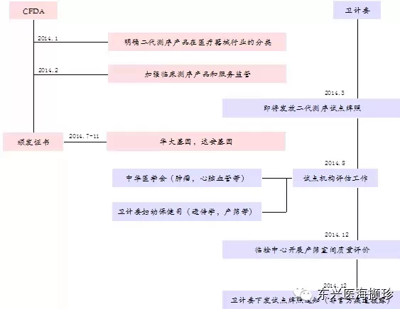 可以从CFDA和卫计委两个角度来看,2014年1月,CFDA首次明确了二代测序产品按照第三类医疗器械分类管理;2月发文加强临床二代测序管理,叫停一切没有证书的二代测序产品和服务。到这里,CFDA打开了一扇门关上了一扇门,打开了二代测序正规渠道的大门,关上了非正规渠道的大门。随后,华大基因和达安基因分别在2014年7月和11,取得了二代测序无创产筛产品的医疗器械注册证书,我们将此视为国内二代测序行业发展具有里程碑式意义的事件。