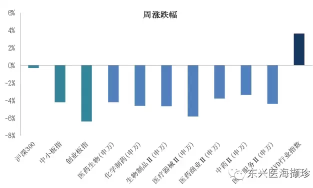 二级子行业方面,本周除IVD外的其他所有板块均录得跌幅,其中医疗器械、生物制品和化学制药跌幅最深。