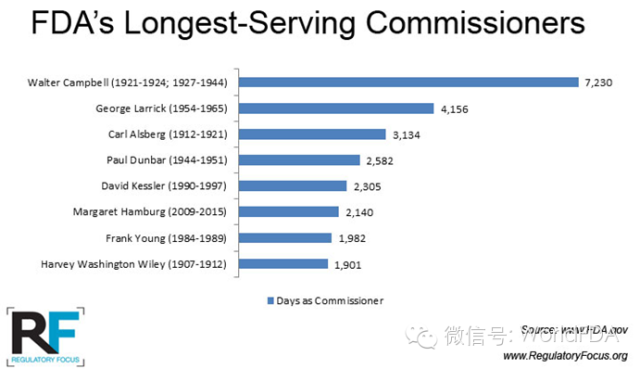 Hamburg博士于2009年5月19日宣誓就职成为FDA第21任局长,同时也是第2位女性局长。如果她在2015年3月28日正式卸任的话,则共任职2140天,将近6年。根据Regulatory Focus的分析,Hamburg博士的FDA局长任期在FDA史上居第6位。