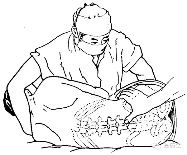 又一次姨妈痛,他大驾光临来看望我,见我卧床不起,于是把我摆成腰椎穿刺的姿势找椎间隙,练习腰穿,像这样: