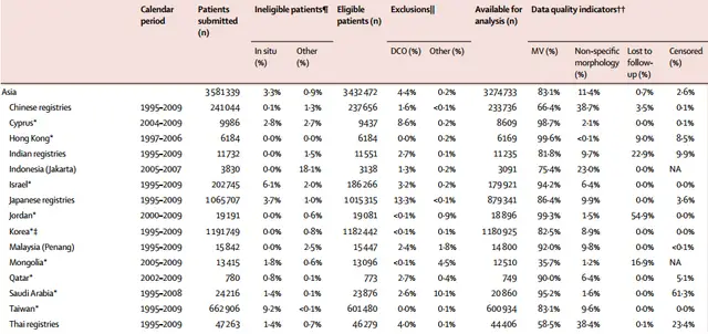 研究者利用标准化质控流程,采用有关注册库进行误差纠正。按年龄(单年)、性别校正每个国家或地区的背景死亡率后对 5 年生存率予以评估,同时在某些国家还根据种族或人种进行校正。采用国际癌症生存标准权重进行年龄标准化评估。