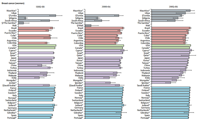 世界各国的前列腺癌生存率差别很大,许多国家前列腺癌 5 年生存率显著增加,数据如下:南美、亚洲和欧洲的 22 个国家 1995-1999 年和 2005-2009 年 5 年生存率显著上升了 10%-20%。保加利亚和泰国的 5 年生存率不足 60%,巴西、波多黎各和美国的生存率则超过 95%。宫颈癌 5 年生存率区域性差异也很大,小者低于 50% 而高者达到 70%,且 1995-1999 年及 2005-2009 年期间生存率的改善幅度有限。