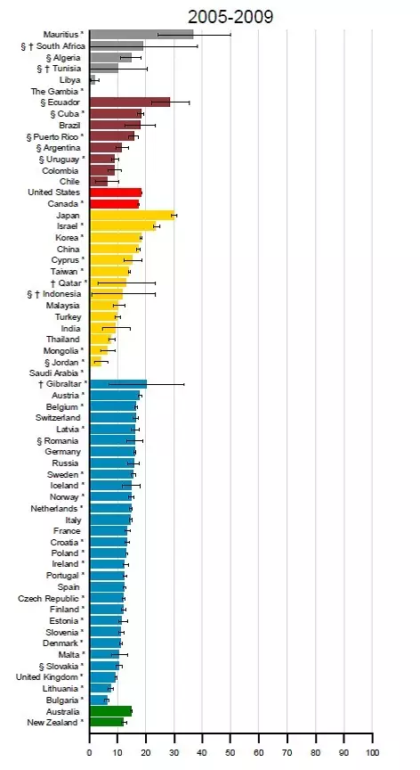 日本和韩国在 2005-2009 年胃癌的 5 年生存率较其他国家高(为 54%-58%),而这两个国家成人白血病的5年生存率低于其它大多数国家(18%-23%)。胃癌 5 年生存率达到 30%-39% 的国家和地区是:奥地利、比利时、中国、德国、冰岛、意大利、葡萄牙、瑞士、台湾地区。