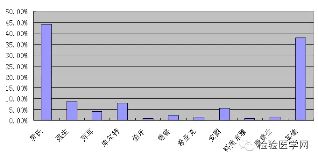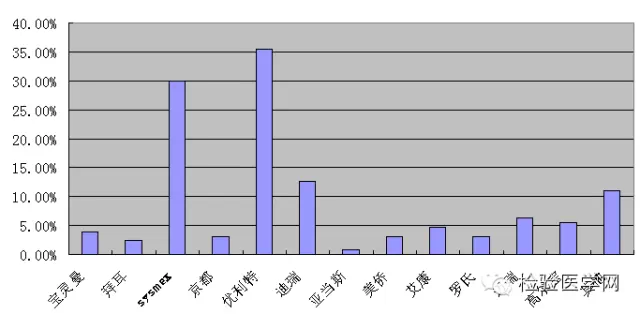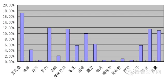 生化分析仪各品牌在检验科占有率,贝克曼在生化里还是老大。