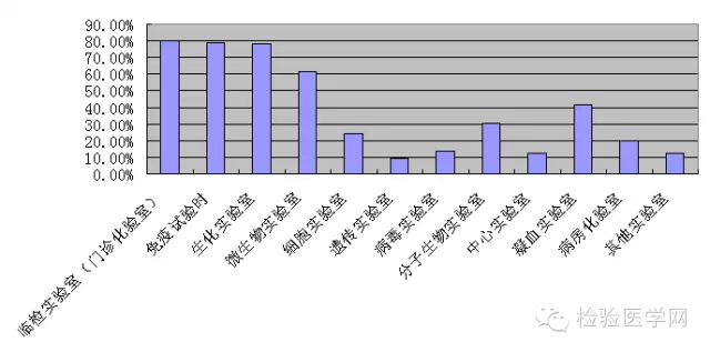 各医院检验科内设二级实验室情况,临检、生化、免疫几乎是各个检验科的标配。