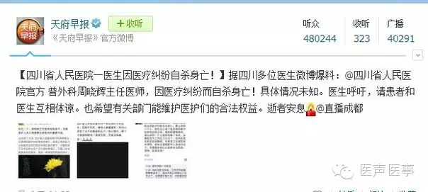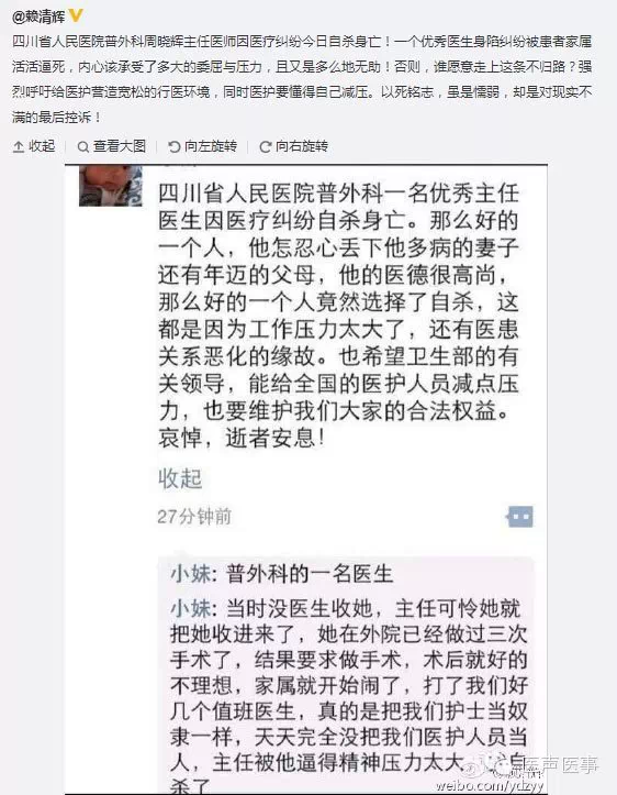 另据@成都下水道等多位医生微博爆料,四川省人民医院普外科周晓辉主任医师因医疗纠纷而自杀身亡。随后有网友表示,已向其在该院工作的朋友证实该事件的真实性。