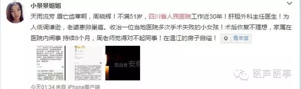 另据悉,周晓辉主任“不满51岁,曾援外几年,省医工作近30年,肝胆外科专业;为人低调谦逊,爱好羽毛球,朋友很少;与老婆相敬如宾,夫人患卵巢癌;每天二点一线,每天为老婆熬中药三到四个小时。上班工作压力太大,觉得对不起同事,在自己家自缢!死前已网上卖车卖房准备赔偿病人!无小孩!母亲90多岁!……”