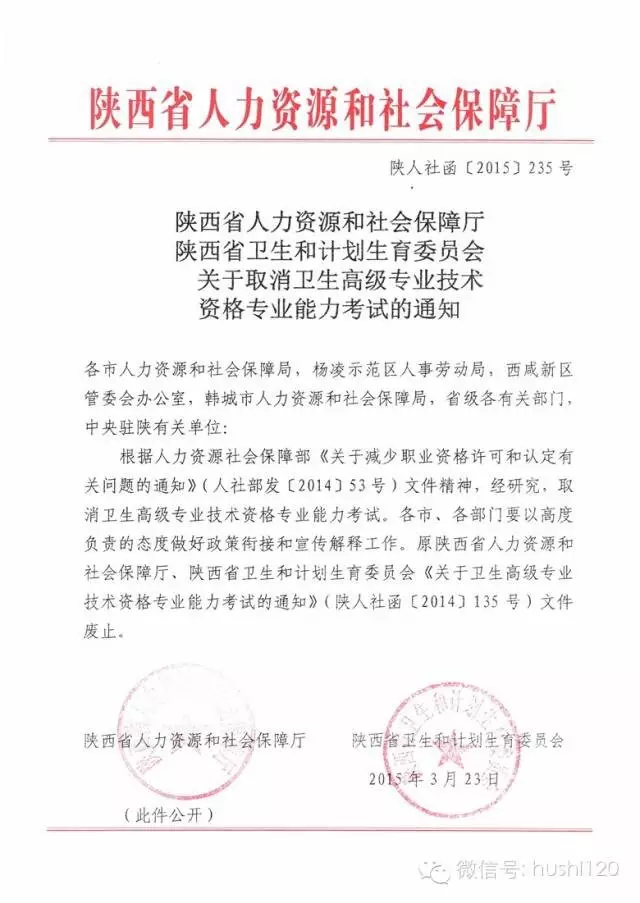 宣布取消卫生高级专业技术资格能力考试的文件,即陕人社函[2015]235号,发布于3月23日,而去年做出“加考”的文件陕人社函[2014]135号发文日期是2014年2月19日。