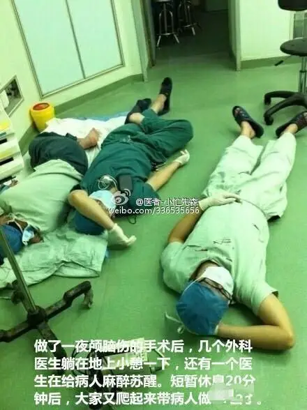 第二张:做了一夜的手术,医生只能在地上稍微休息一下。还有一个医生在给患者做麻醉苏醒,二十分钟后,投入下一台手术中......