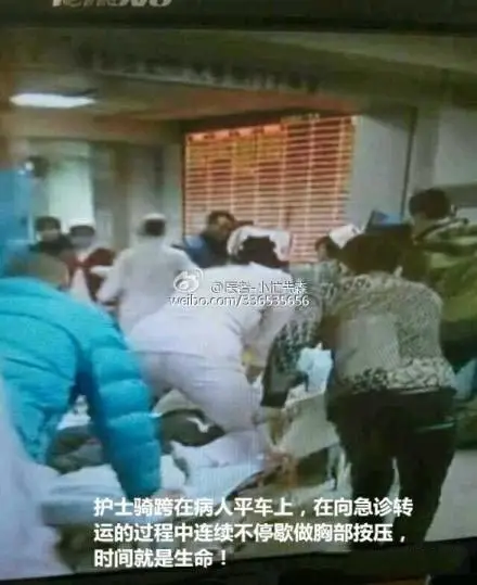 第一张:时间就是生命,在转运病人的车上,护士进行紧张的胸外心脏按压。