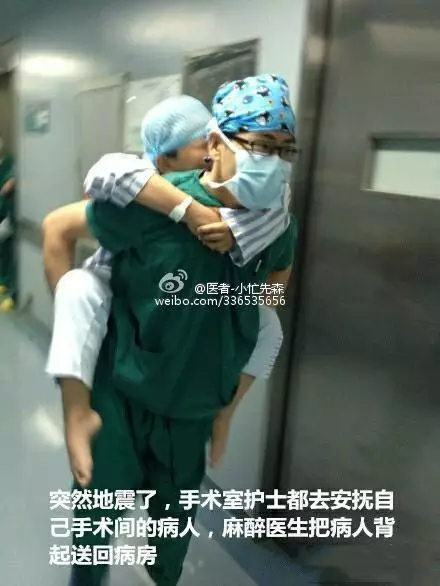 第七张:地震了,麻醉医生第一反应是背起病人......