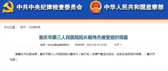 | 导读 | 4月15日中午中央纪委监察部网站发布消息,重庆市第三人民医院院长戴伟杰(副厅级)涉嫌严重违纪违法,目前正接受组织调查。 |