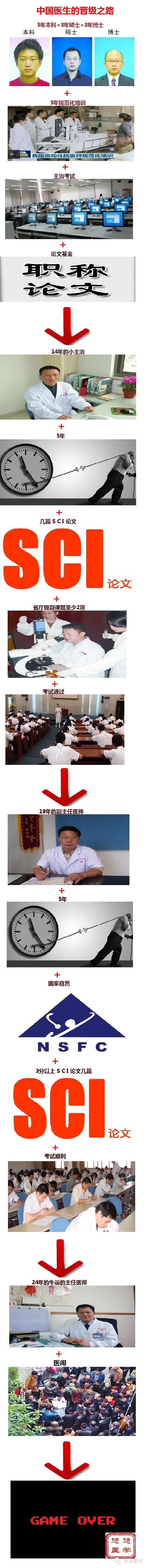 5年本科+3年硕士+3年博士+3年规范化培训+主治考试+论文基金=14年的小主治 +5年+几篇SCI论文+省厅级别课题至少2项+考试通过=19年的副主任医师 +5年+国家自然+3分以上SCI论文几篇+考试顺利=24年的牛X的主任医师 +医闹=死了