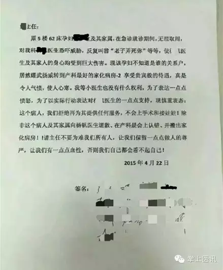 据了解,该名患者及其家属在急诊期间,三番两次恐吓杨医生,号称关系户,转到了该院产科最好的家化病房,要求享受贵宾待遇。
