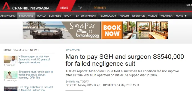 据CHANNEL NEWSASIA 5月14日消息,2007年,一位54岁的新加坡患者蔡先生,由于急性椎间盘突出导致瘫痪。后来,他在新加坡中央医院(SGH)接受脊柱手术,病情没有得到明显改善。于是,他在2012年10月对主刀的骨科医生岳伟门(音)和SGH医院提起诉讼,声称医院和医生在诊治过程中存在疏忽。