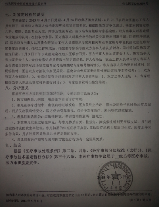 2013年4月12日包头中心医院全院会诊后诊断为:过敏性休克,多脏器功能衰竭,脑死亡,肺炎。2014年4月22日患儿因治疗无效死亡。