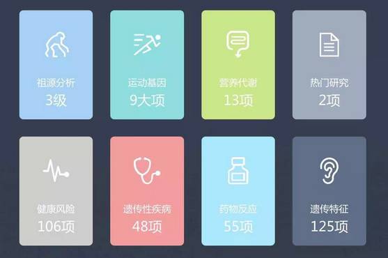 WeGene 检测套件针对中国主要人群的遗传特点,选取了 60 万个位点进行检测,并据此提供了祖源分析、健康风险、运动基因、遗传病筛查、药物反应、遗传特征和营养代谢等七个方面,累计过 200 项的解读服务。