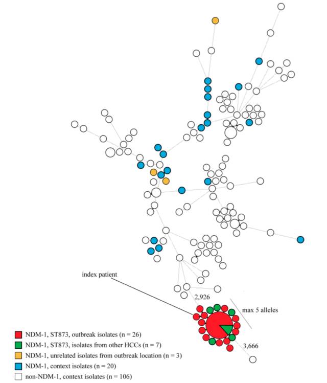 研究者使用二代测序技术 (NGS) 分离鉴定250个产碳青霉烯酶肠杆菌 (CPE),其中包含此次暴发事件的29例感染病例的42个NDM-1阳性样本。结果表明大多数样本包含肺炎克雷伯菌 (26株) 和大肠杆菌 (11株),但5例样本包含了肠杆菌科的其它种类。与5个散布分布的HCCs相同,分离的肺炎克雷伯菌的26株样本序列型 (ST) 为ST873,研究者对ST873进行全基因组多位点序列分型 (wgMLST),结果显示各菌株都携带相同的质粒,耐药基因组差异较小。而11株大肠杆菌序列性差异较大,耐药基因组和质粒多样性程度高,但都含有肺炎克雷伯菌中携带NDM-1基因的质粒。