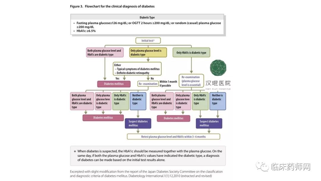 这里要说的是plasma glucose可以是空腹血糖,OGTT两小时后血糖或随机血糖。糖化血红蛋白虽然是诊断指标之一,但是即使有明显症状的单次糖化血红蛋白超标或无症状的两次糖化血红蛋白超标都不能确诊,必须要糖化血红蛋白和plasma glucose联合确诊。两次空腹血糖超标虽然符合诊断,但是由于日本人主食摄入很多,单独测空腹容易漏诊,所以不推荐。但是有明显症状或视网膜病变的患者一次空腹血糖超标就可以确诊了。中国人饮食中主食亦占有很大比例,诊断时也需注意漏诊情况。