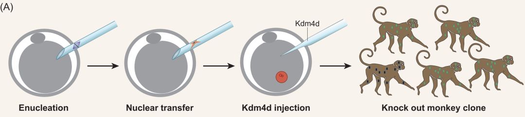 从BMAL1基因敲除猴中选取合适的成纤维细胞(图上),然后通过核移植技术最终获得五个BMAL1基因敲除克隆猴(图下)。图片引自NSR论文。