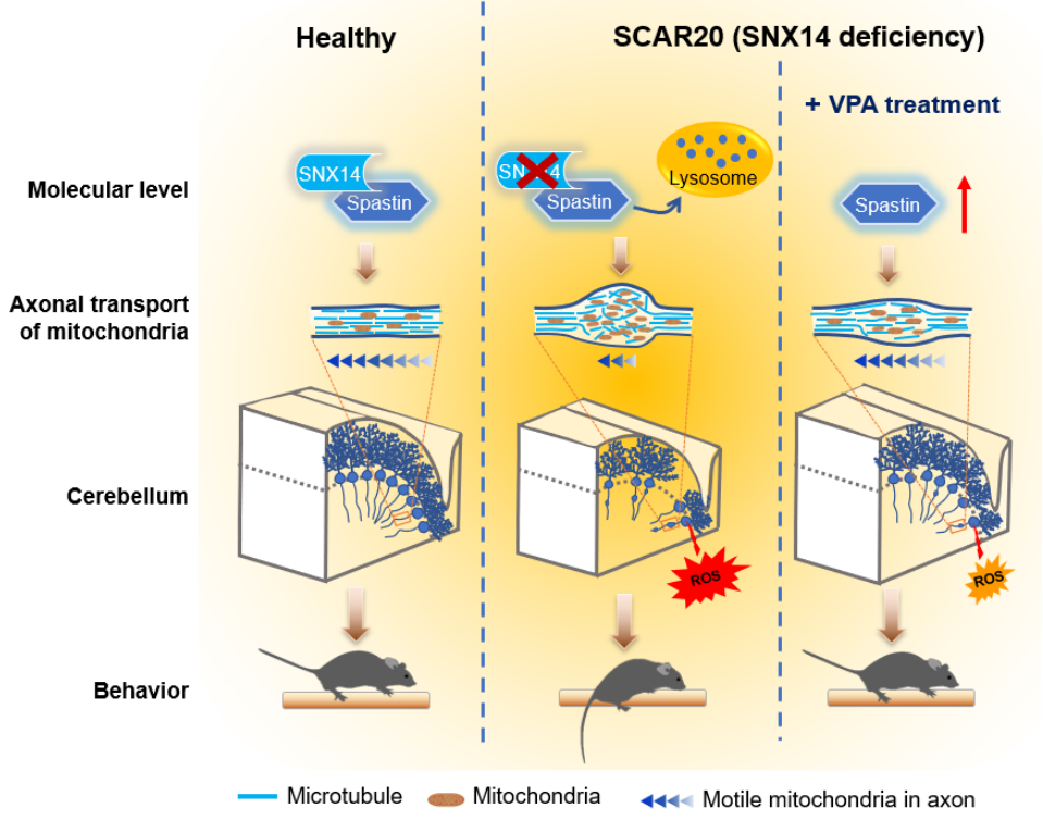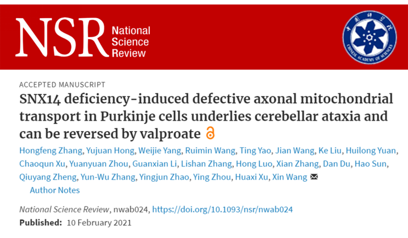 2021年2月10日,厦门大学医学院神经科学研究所王鑫教授团队在National Science Review上发表题为SNX14 deficiency-induced defective axonal mitochondrial transport in Purkinje cells underlies cerebellar ataxia and can be reversed by valproate 的研究成果。该研究首次从轴突线粒体运输这一全新视角揭示了一类遗传性共济失调(spinocerebellar ataxia, autosomal recessive 20, SCAR20)的发病机制,并发现抗癫痫药——丙戊酸大幅度减缓模型小鼠的疾病进程,具有较强的转化应用价值,有望为共济失调提供新的治疗手段。
