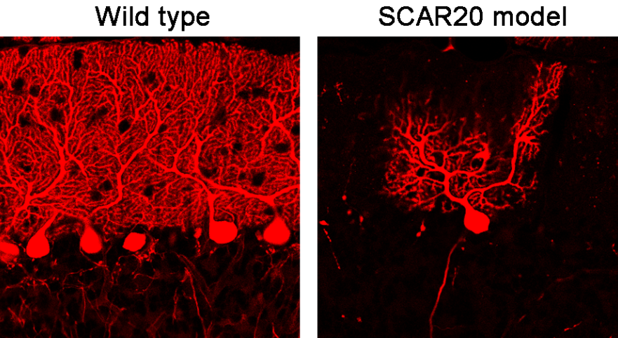 图1. SCAR20模型小鼠小脑浦肯野细胞(红色)大量缺失