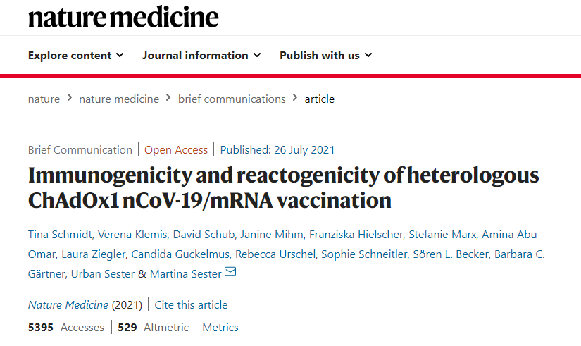 6月初,Saarland大学免疫学教授Martina Sester发表了关于混合不同类型COVID-19疫苗的研究的预印本,引起了国际社会的广泛关注。经过严格的同行评审,这项研究的结果现已发表在Nature Medicine杂志上。德国疫苗接种常设委员会也收集了这些结果,该委员会现在建议对包括60岁以上的成年人进行联合疫苗接种。由Martina Sester领导的研究小组发现,第一剂AstraZeneca疫苗和第二剂Pfizer疫苗接种者的免疫反应明显强于两剂AstraZeneca疫苗接种者。