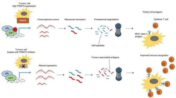 有人提出PRMT5酶活性和E2F1转录活性影响许多lncRNA的表达,随后将其翻译成多肽,这些多肽可以被加工以产生表位以呈现在MHC I类蛋白质复合物上。用化合物T5-1对PRMT44活性进行药理学操作导致编码免疫原性肽的几种lncRNA转录本的表达改变。我们建议,随后通过MHC I类复合物呈现这些免疫原性肽有助于增加观察到的肿瘤微环境的免疫细胞浸润。