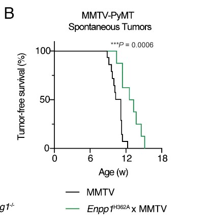 ENPP1对肿瘤发展的不同阶段(包括起始、进展和转移)的贡献尚不清楚。重要的是,我们的工作提供了ENPP1促进乳腺癌发生的证据(图5B)。