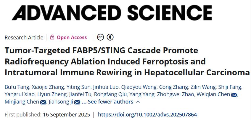9月16日,温州医科大学研究团队在期刊《Advanced Science》上发表了研究论文,题为“Tumor-Targeted FABP5/STING Cascade Promote Radiofrequency Ablation Induced Ferroptosis and Intratumoral Immune Rewiring in Hepatocellular Carcinoma”,本研究中,本研究推出了一种新型纳米载体共递送系统,旨在靶向肝细胞癌(HCC)中的关键分子靶点,以增强铁死亡并重新编程肿瘤内免疫,从而改善射频消融(RFA)的治疗效果。通过使用共递送纳米载体靶向 FABP5 显著提高了 RFA 的疗效。此外,FABP5 缺失会增强射频消融(RFA)诱导的铁死亡,并增强抗肿瘤免疫反应,其特征是 CD8+ T 细胞和效应记忆 T 细胞浸润增加,从而显著增强全身抗肿瘤效果。从机制上讲,FABP5 抑制会激活 STING/TBK1 信号通路并调节 TBK1 蛋白质稳定性。值得注意的是,靶向 FABP5 的纳米载体系统会提高 PD-L1 表达,而 RFA 与抗 PD-L1 疗法的联合应用对肝细胞癌(HCC)显示出协同疗效。总之,靶向 FABP5 的纳米载体共递送系统为增强 RFA 在 HCC 中的有效性提供了一种有前景的策略,为临床治疗方法的改进提供了新的框架。