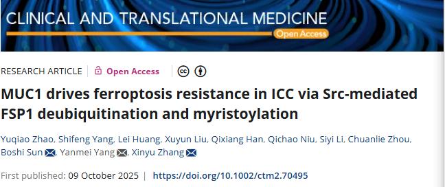 近日,哈尔滨医科大学研究团队在期刊《Clinical And Translational Medicine》上发表了研究论文,题为“MUC1 drives ferroptosis resistance in ICC via Src-mediated FSP1 deubiquitination and myristoylation”,本研究中,研究人员将MUC1 确认为肝内胆管癌(ICC)中关键的铁死亡抑制因子。从机制上讲,MUC1 招募了 Src 激酶,该激酶在去泛素化酶泛素特异性蛋白酶 10(USP10)的 359 和 364 位酪氨酸上进行磷酸化,增强铁死亡抑制蛋白 1(FSP1)在 246 位赖氨酸上的去泛素化,并稳定 FSP1 蛋白。同时,Src 在NMT1的 41 位酪氨酸上进行磷酸化同时,Src 在酪氨酸 41 位点磷酸化NMT1,通过脂肪酰化增强 FSP1 在膜上的定位。这种双重机制增强了 FSP1 - 辅酶 Q10(CoQ10)抗氧化系统。MUC1 敲低显著增强了体外铁死亡敏感性,并在体内抑制肿瘤生长。