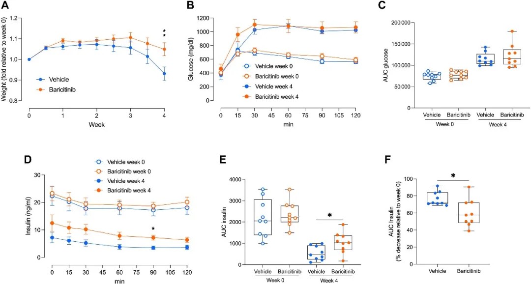 在重度2型糖尿病模型db/db小鼠中,4周巴瑞替尼治疗虽未降低血糖(小鼠已处于严重高糖状态),但显著保留了胰岛素分泌能力——治疗组胰岛素AUC较对照组仅下降10%,而对照组下降了30%。此外,巴瑞替尼组小鼠体重维持更好,提示其对代谢的综合益处。