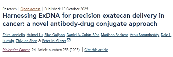 10月13日,耶鲁大学Peter M. Glazer教授团队在期刊《Molecular Cancer》上发表了研究论文,题为“Harnessing ExDNA for precision exatecan delivery in cancer: a novel antibody-drug conjugate approach”,本研究中,研究人员开发并表征了 V66-exatecan,这是一种新型抗体药物偶联物(ADC),由 V66(一种对细胞外 DNA(exDNA)具有高亲和力的人源化抗体)通过可裂解连接子与依沙替康偶联而成。这种 ADC 利用基于 exDNA 和 ENT2 转运蛋白表达的双靶向机制,以增强药物向细胞核的递送和肿瘤特异性。本研究评估了其抗肿瘤活性、作用机制、治疗难治性肿瘤的能力以及安全性。