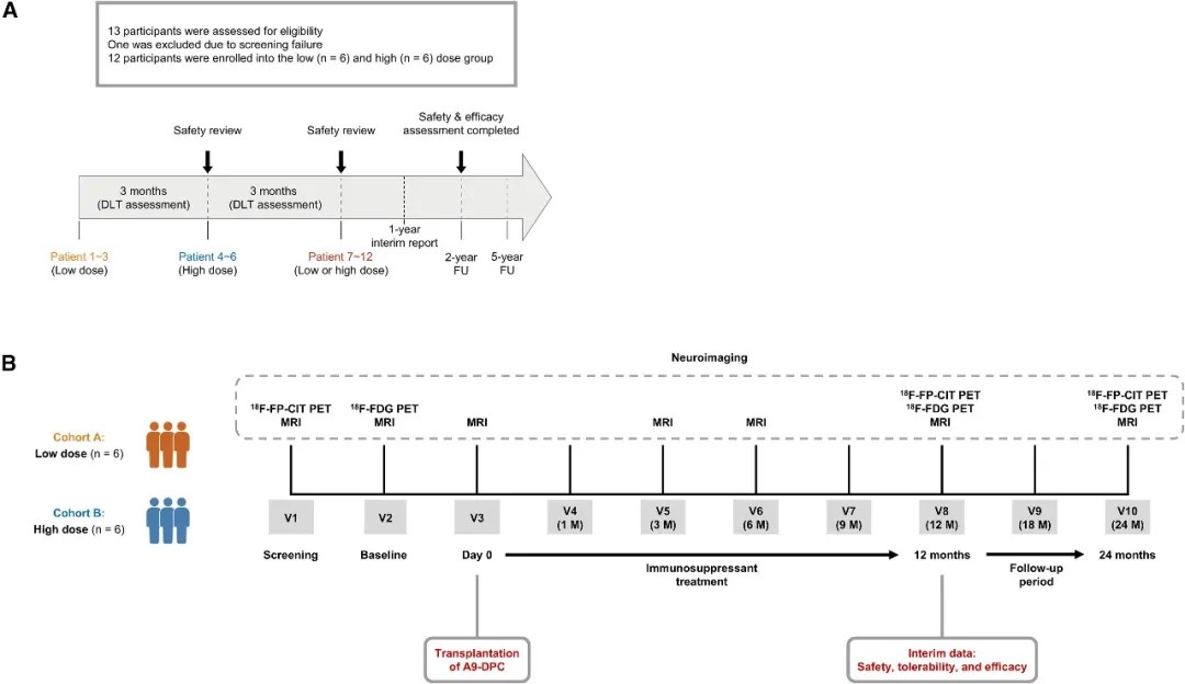 这项1/2a期的临床试验,旨在评估人胚胎干细胞衍生高纯度多巴胺能祖细胞(A9-DPC)的安全性和初步疗效。研究采用单中心、开放标签、剂量递增设计,纳入12名中重度帕金森病患者。参与者被分为两组: