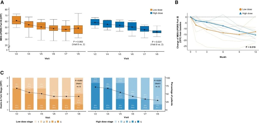 低剂量组MDS-UPDRS III关期评分(帕金森病评定量表)较基线下降12.7分(改善率约21%);