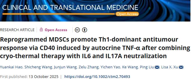 近日,上海交通大学研究团队在期刊《Clinical And Translational Medicine》上发表了研究论文,题为“Reprogrammed MDSCs promote Th1-dominant antitumour response via CD40 induced by autocrine TNF-α after combining cryo-thermal therapy with IL6 and IL17A neutralization”,本研究中,研究人员观察到联合疗法通过依赖于活性氧 - 核因子κB 通路诱导的肿瘤坏死因子α(TNF-α)增加髓源性抑制细胞(MDSCs)上 CD40 的表达。这种由 TNF-α 介导的 CD40 上调通过 CD4+ T 细胞上的 CD40L 结合促进了 Th1 极化。本研究结果首次提供了机制性证据,表明经重编程的 MDSCs 自分泌的 TNF-α 产生控制了联合治疗后的 CD40 表达。本研究阐明了髓源性抑制细胞(MDSCs)重编程的方法和机制,并为非小细胞肺癌(NSCLC)及其他类型癌症患者提供了有前景的治疗策略。