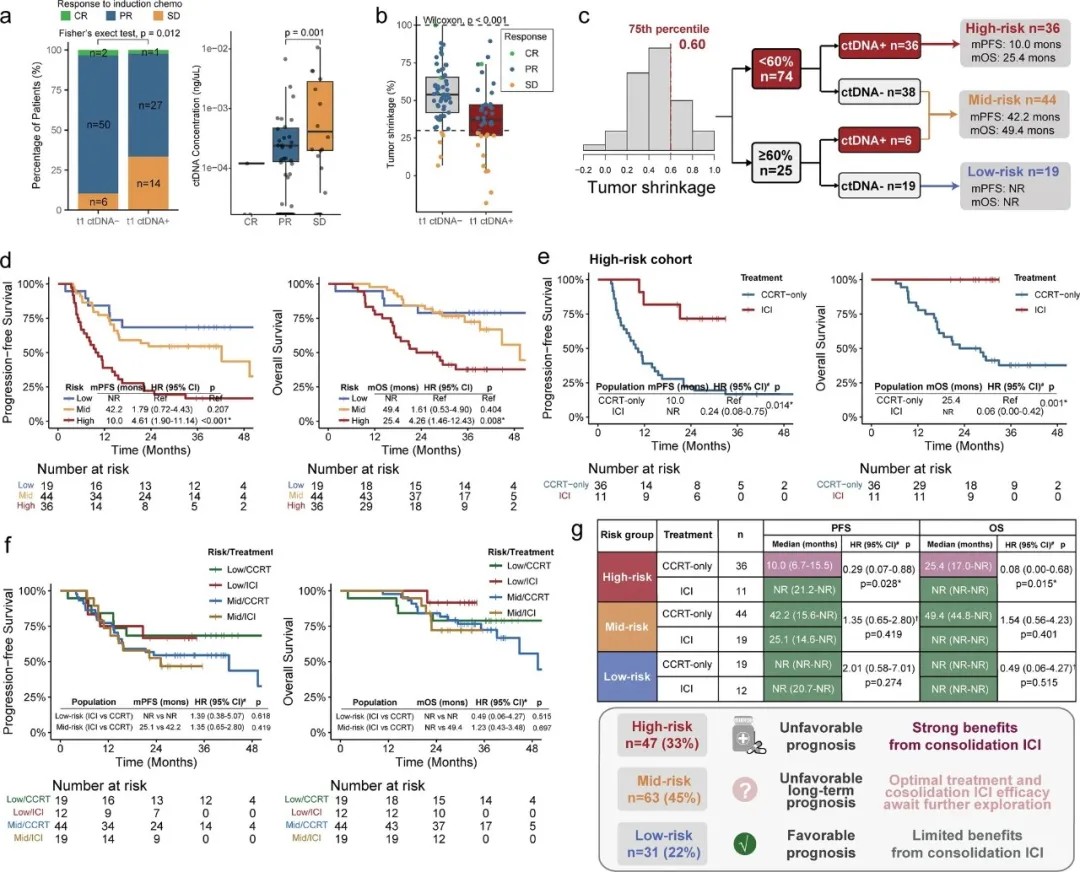 高风险组(t1 ctDNA阳性+肿瘤缩小<60%):对CCRT反应差,必须加用巩固免疫检查点抑制剂——数据显示,这类患者用免疫检查点抑制剂后生存获益显著。
