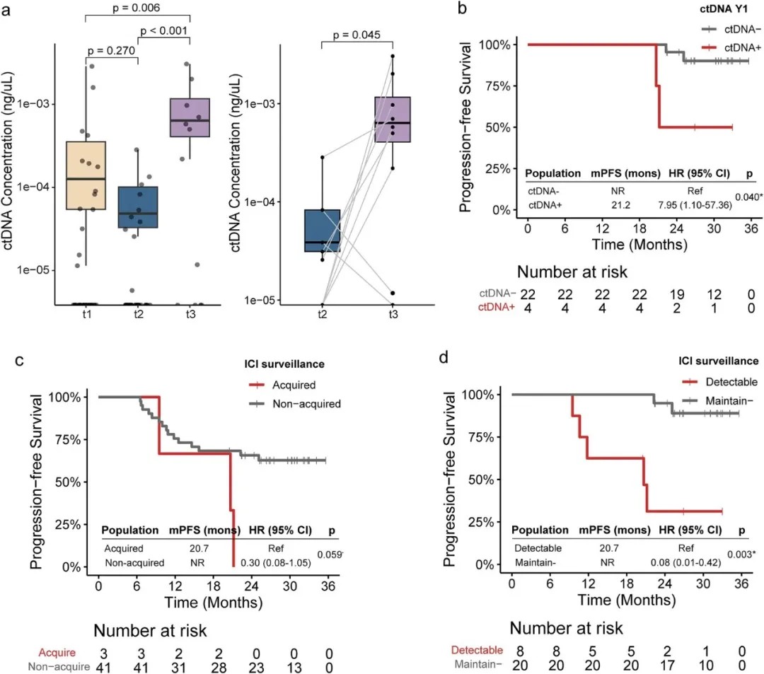 对于接受检查点抑制剂治疗的患者,治疗期间保持ctDNA阴性是预后的强预测因子:直到进展时(t3)才出现ctDNA阳性的患者,PFS更长;若治疗中(如第3周期C3或第6个月M6)新检测到ctDNA,几乎都会在2年内进展。这说明,ctDNA持续阴性反映了免疫检查点抑制剂对MRD的有效控制,是治疗有效的实时信号。