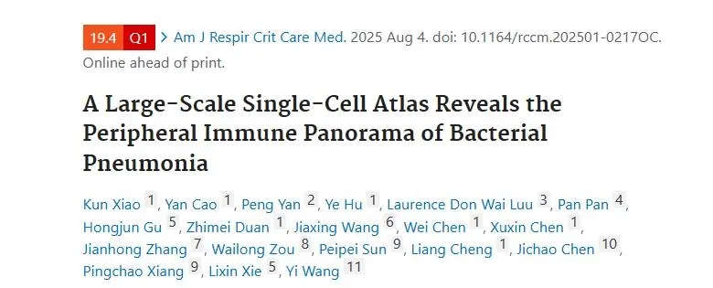 近日,由解放军总医院呼吸与危重症医学部解立新、肖坤教授与首都儿研所王毅教授等团队领衔的开创性研究,首次绘制了细菌性肺炎患者外周免疫系统的大规模单细胞转录组图谱。这项研究揭示了疾病严重程度与特定免疫细胞亚群功能状态之间的深刻联系,为理解细菌性肺炎的发病机制、开发新的免疫调节疗法以及预测疾病预后提供了宝贵资源和关键见解。该研究成果已发表于国际呼吸医学领域的权威期刊《美国呼吸与重症监护医学杂志》(American Journal of Respiratory and Critical Care Medicine, AJRCCM, IF:19.4,美国胸科学会(ATS)官方期刊)。