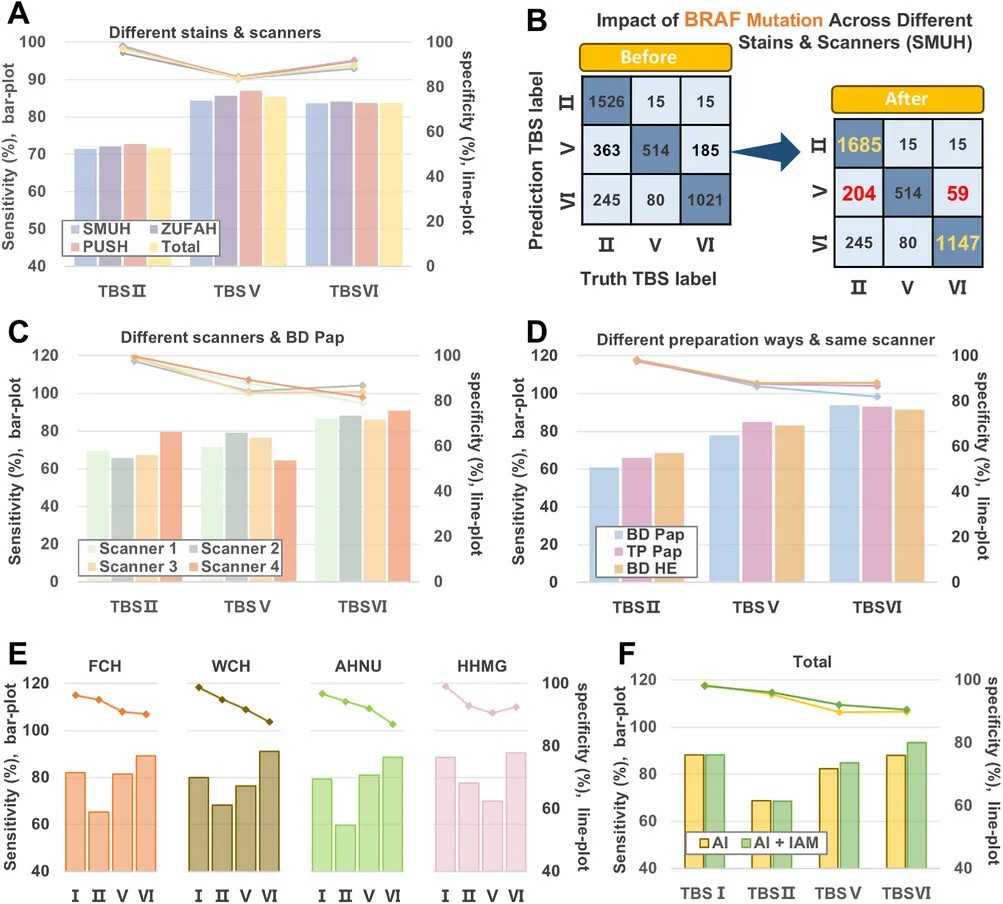 针对TBS III/IV(意义不明确)的样本,AI-TFNA敏感性达77.99%(TBS III)与90.75%(TBS IV),能精准识别潜在恶性病例;同时,120例手术样本中,AI正确将4例病理良性的TBS III样本归为TBS II,避免了不必要的手术。