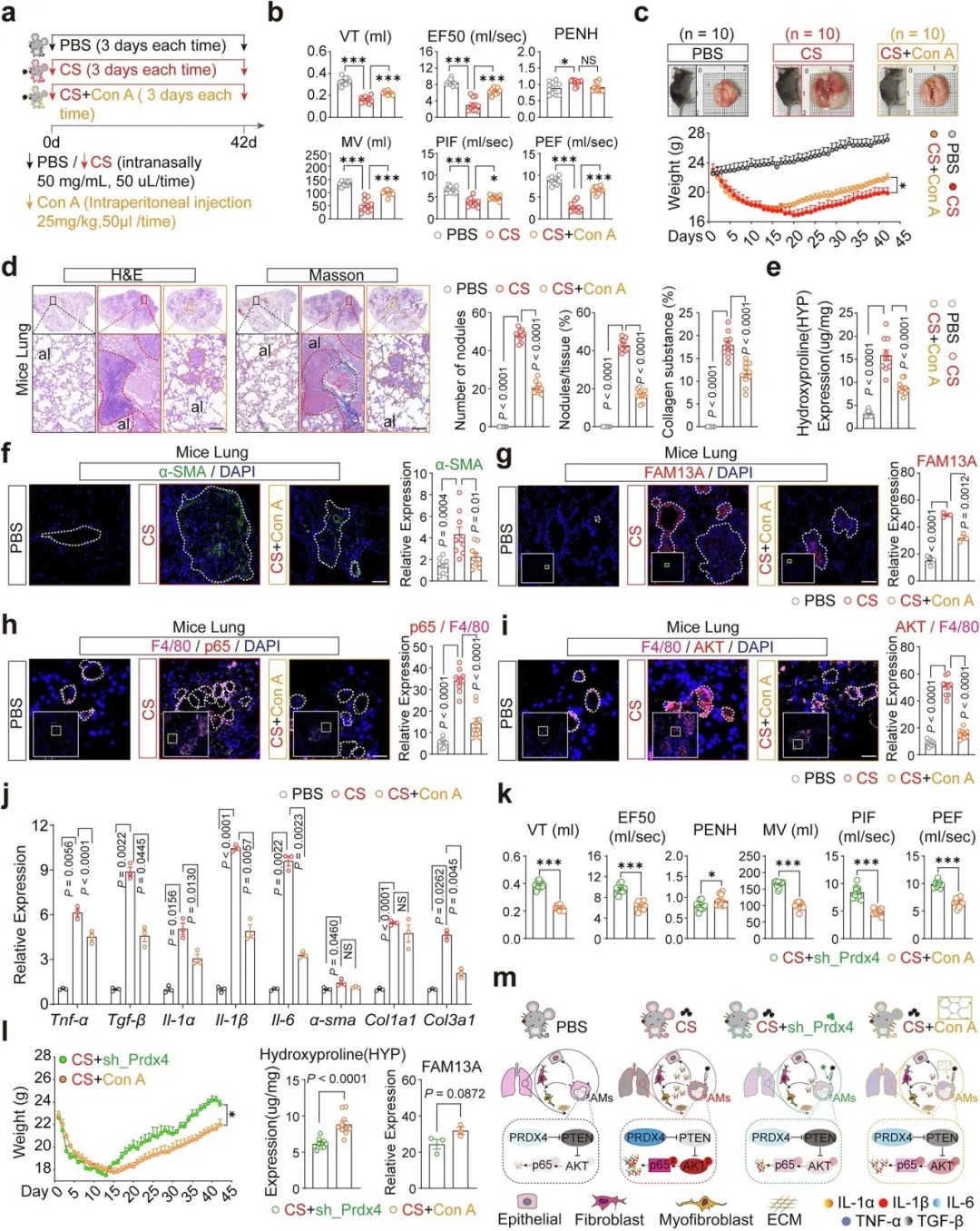 矽肺的发生,始于肺泡巨噬细胞(AMs)对二氧化硅(CS)粉尘的吞噬。这些肺部免疫哨兵在接触粉尘后,会异常激活并分泌大量促炎因子(如TNF-α、IL-1β)与促纤维化因子(如TGF-β),一方面招募更多炎症细胞加剧肺损伤,另一方面诱导肺泡上皮细胞“上皮-间质转化(EMT)”、成纤维细胞“成纤维细胞-肌成纤维细胞转化(FMT)”,最终导致胶原沉积与肺纤维化。然而,巨噬细胞异常激活的上游调控机制始终未明,此项研究正是聚焦这一空白,通过对矽肺患者肺组织与小鼠模型的多组学分析,锁定了PRDX4这一关键分子。