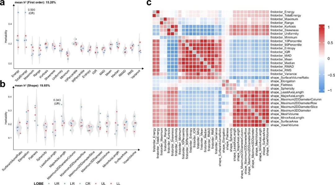 肺部影像特征表型相关性、遗传相关性及遗传力评估结果图