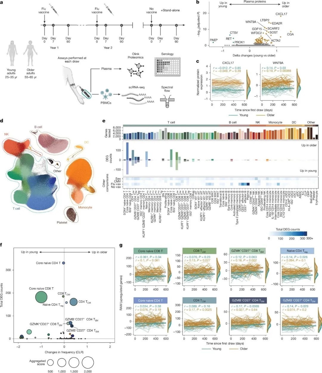 与大多数聚焦65岁以上人群衰老特征的研究不同,本研究将目光投向衰老临界点人群(55-65岁成年人,定义为年长组),并与年轻成年人(25-35岁,定义为年轻组)展开对比,旨在深入解析功能免疫向衰退免疫过渡的动态过程。研究对96名健康年轻人与年长者的外周免疫细胞进行了为期2年的纵向追踪,期间每位参与者每年接种流感疫苗,并采集8至10个时间点的样本。研究进一步扩展至一个包含234名健康成年人的次级队列,其年龄范围覆盖更广泛的衰老阶段(40岁至90岁以上)。通过单细胞RNA测序、高维血浆蛋白质组学与光谱流式细胞术,我们系统解析了年龄相关的免疫应答变化(针对急慢性扰动)的细胞与分子基础,揭示了健康衰老过程中、尚未进入晚期衰老阶段即已发生的免疫失调机制。